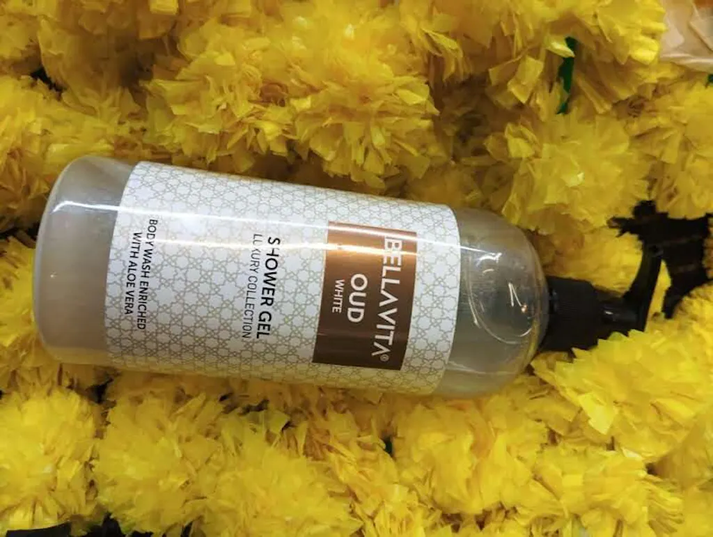 A. The shower gel is infused with WHITE OUD perfume oil which helps to provide the same fragrance and feel in the shower gel. The aroma gives a calm, serene, and relaxed feeling for a refreshed bathing experience.